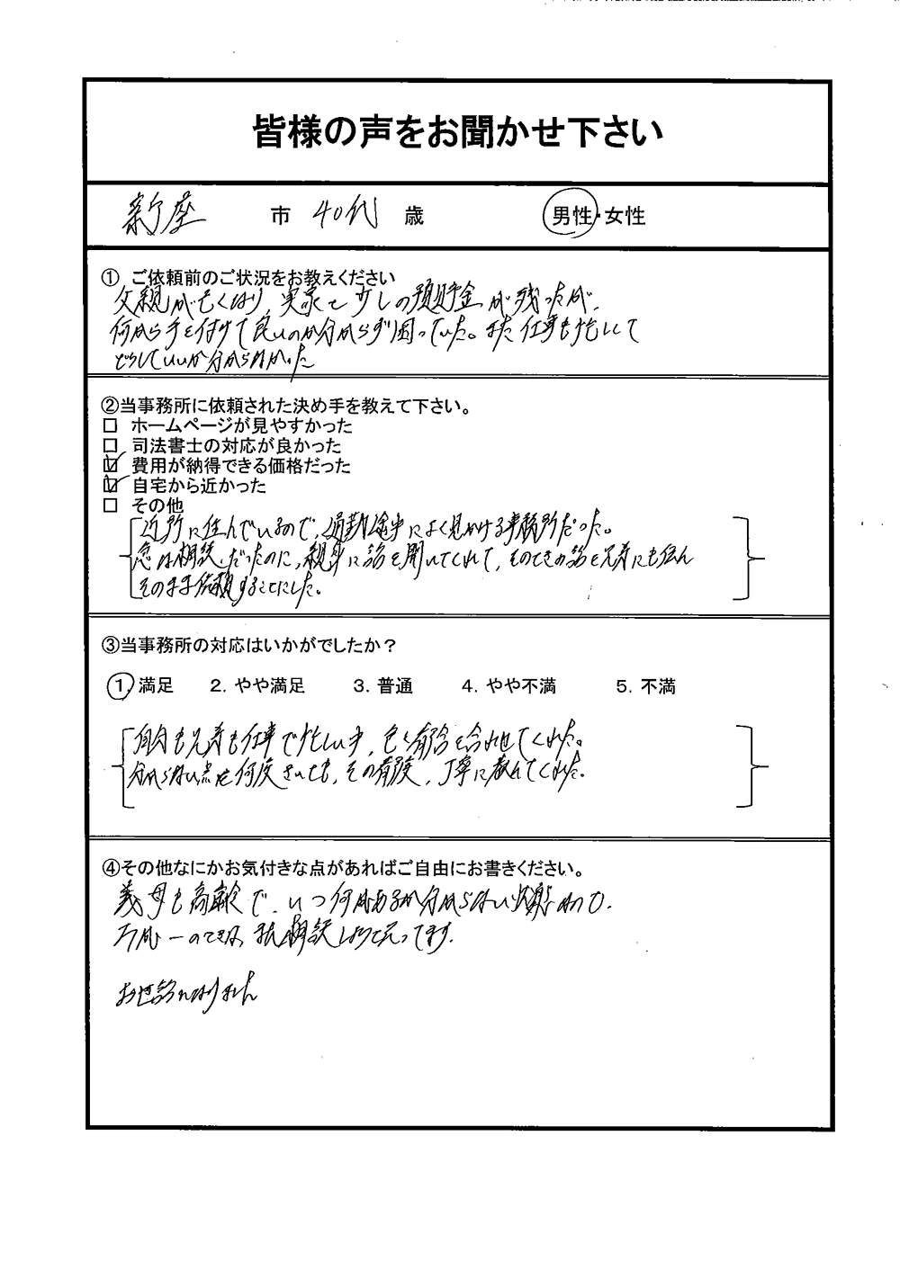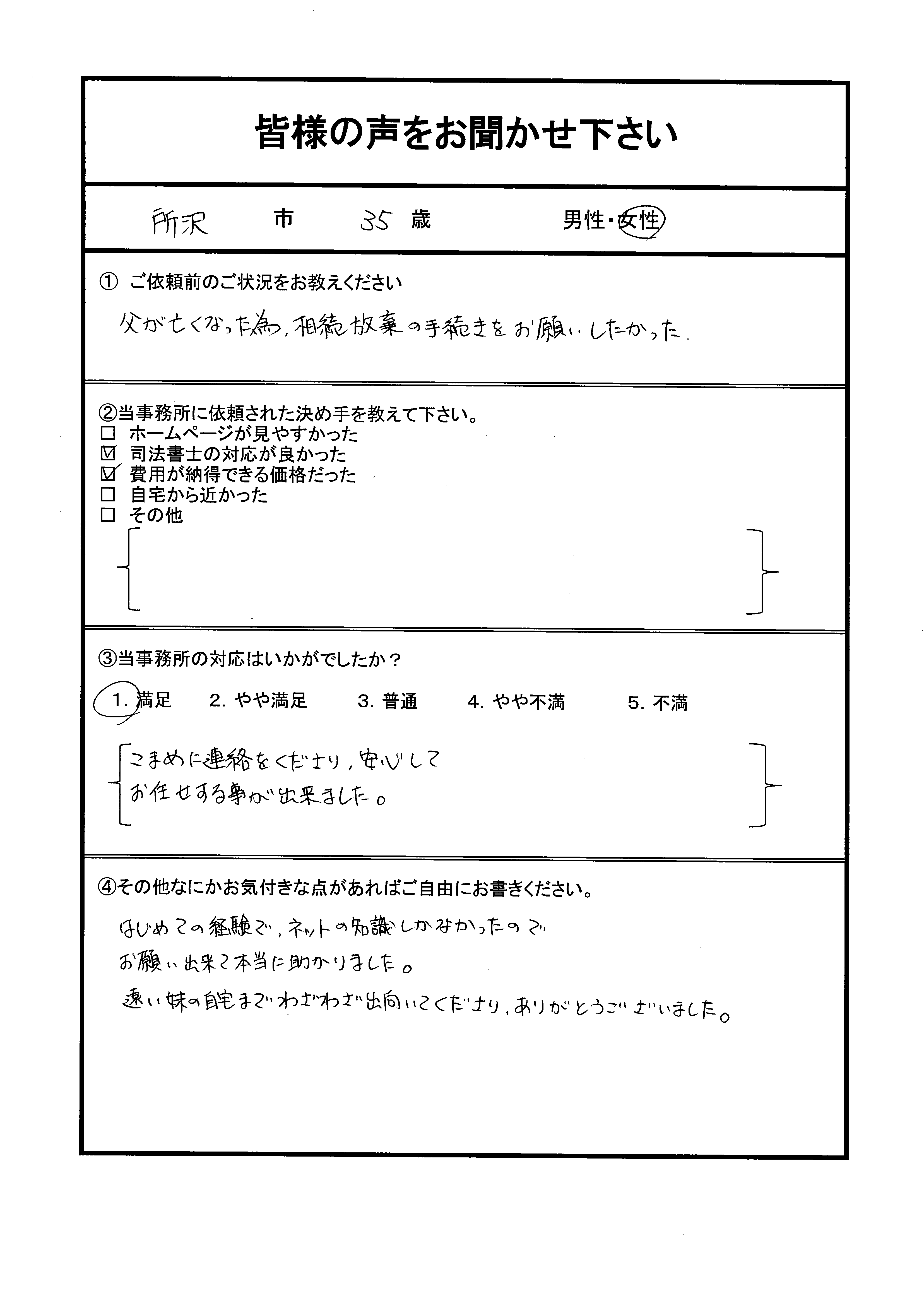 父親が亡くなり実家と少しの預貯金が残ったが、何から手を付けてよいかわからず困っていた。近所に住んでいいるので通勤途中に見かける事務所だった。急な相談だったのに親身に話を聞いてくれて、その時の話を兄にも伝え、そのまま依頼することにした。自身も仕事で忙しいなか都合を合わせてあわせてくれ、わからない点もその都度丁寧に教えてくれた。 お世話になりました。